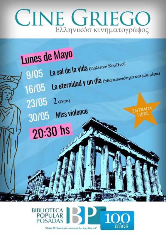 El lunes 16 de mayo, a las 20:30, se podrá ver La eternidad y un día (Theo Angelopoulos), el lunes 23 de mayo se pasará Z (Costa-Gavras). El cierre será el 30 de mayo con Miss Violencia (Alexandros Avranas).