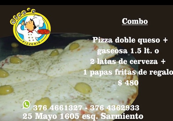 Otros combo al que pueden acceder los clientes, incluye una pizza doble queso, más una gaseosa de un litro y medio o dos latas de cerveza y unas papas fritas de regalo, cortesía de Ciro´s Exquisiteces a solo 480 pesos.