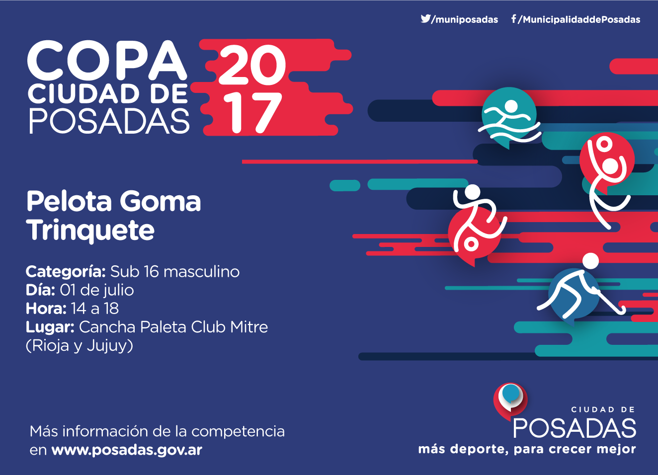 Para más información está disponible el sitio web http://posadas.gob.ar/copa-ciudad-de-posadas-2017/ o, personalmente en la Dirección General de Deporte, situada en el 2° piso de la Municipalidad de Posadas (San Martín 1579) de 7 a 12 y de 13 a 18.
