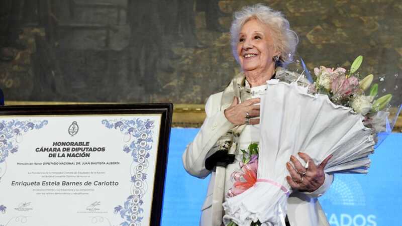 La titular de Abuelas de Plaza Mayo, Estela de Carlotto, recibió este miércoles de manos del presidente de la Cámara de Diputados, Sergio Massa, la «Mención de Honor Juan Bautista Alberdi» por su compromiso en la defensa de los derechos humanos.