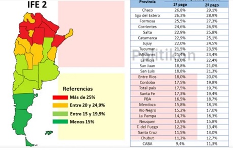 En este marco, se destaca que las cuatro provincias del NEA se ubican entre las diez primeras de todo el país, junto a las seis provincias del NOA, tal y como ocurrió en el primer pago del IFE.
