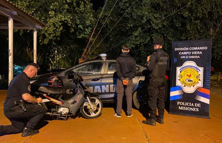 Un joven de 21 años fue detenido durante la madrugada en Campo Viera, luego de ser sorprendido circulando por la zona urbana realizando contraexplosiones y maniobras peligrosas a bordo de una motocicleta, poniendo en riesgo su integridad física y la de terceros. El rodado fue secuestrado por infracción a la Ley XIV N° 5.