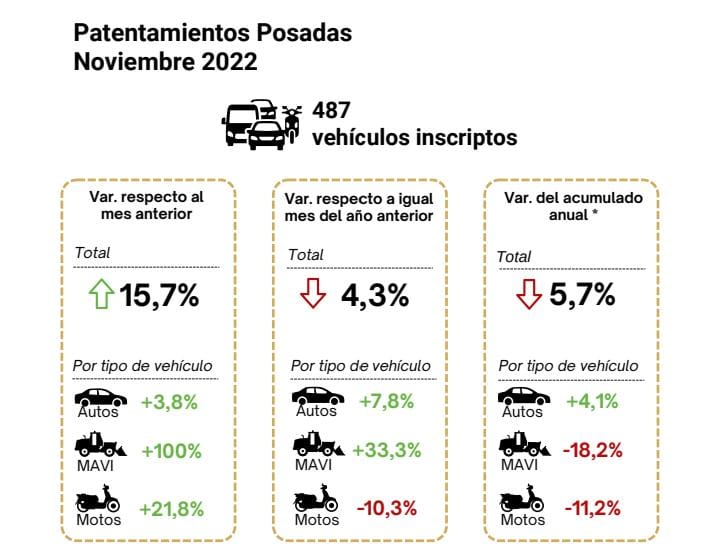 Motovehículos: Respecto a los patentamientos de motos en todos los periodos considerados, se observa un mayor registro de este tipo de vehículo en las demás localidades que en Posadas. Sin embargo, se puede destacar que en noviembre de 2022, el patentamiento de motos se incrementó 21,8%, con respecto a octubre, mientras en las demás localidades cayó 7,7%. Por su parte, en la comparación interanual, en Posadas se registró una caída de 10,3%, mientras que en las demás localidades la caída fue mayor (-34,5%).