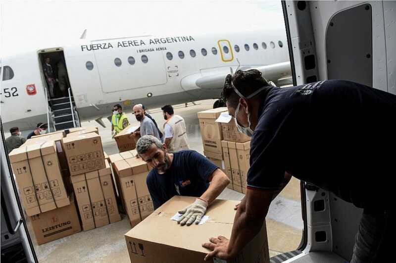 Un avión de la Fuerza Aérea partió de Aeroparque equipado con 23 respiradores para entregar en las provincias de Salta, Jujuy, Santiago del Estero, Catamarca y La Rioja, y otros 26 en Formosa, Corrientes y Misiones, además de partidas de alcohol en gel y pulverizadores, entre otros materiales básicos.