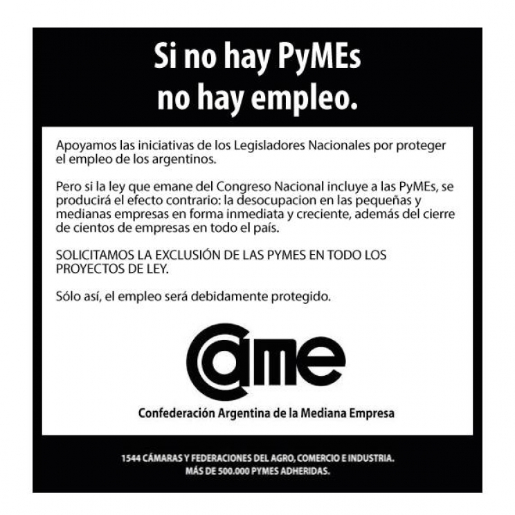 En el escrito enviado los representantes misioneros en la Cámara Baja del Congreso Nacional, solicita que “queden excluidas de la presente ley, las micros, pequeñas y medianas empresas, consideradas tales las empresas que empleen hasta 50 trabajadores en el sector comercio, 50 trabajadores en el sector agroindustria y 80 trabajadores en el sector industria. Todo ello siempre que su facturación anual no supere los importes que establece la reglamentación a la Ley 25.300 de Micro, Pequeñas y Medianas Empresas” “No escapa a su conocimiento, que el 90 % de nuestras empresas, están contenidas de esta reglamentación.” concluye el escrito.