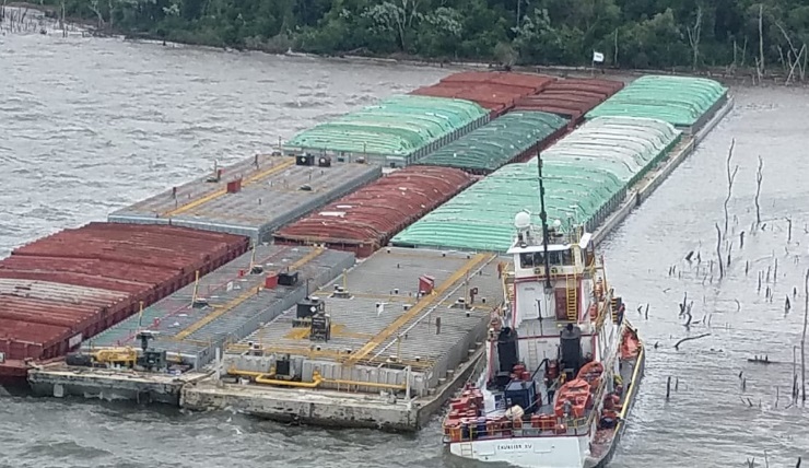 La asistencia comenzó luego de que personal de la empresa se comunicara a la línea de emergencias náuticas (106), donde alertaban de la desesperante situación en la que se encontraba el buque de bandera paraguaya, que además llevaba doce barcazas.