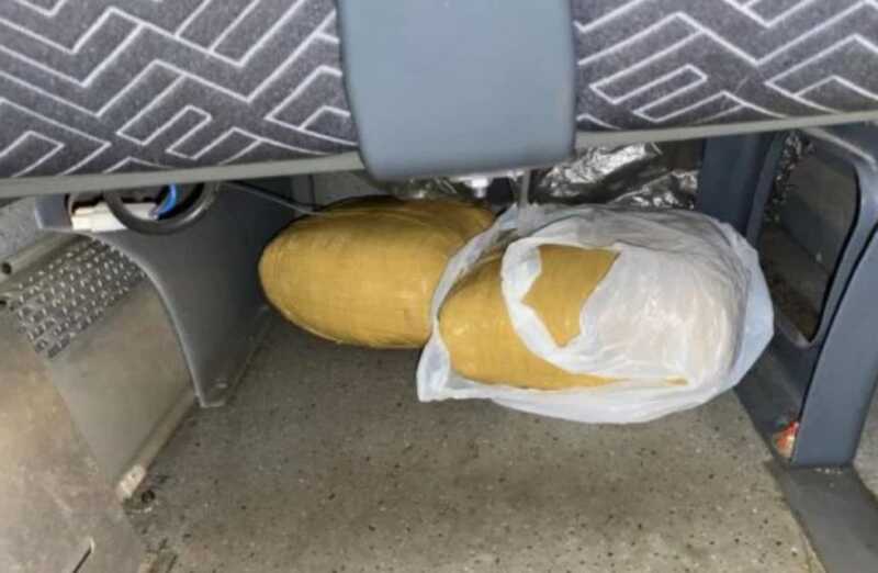 Personal interviniente junto al apoyo con Guía – Can “León” efectuaron el control del piso superior del transporte, a la altura de la butaca 44, la cual se encontraba desocupada. El animal reaccionó como lo hace habitualmente en presencia de estupefaciente sobre dos bultos amorfos envueltos con cinta de embalar color ocre, los cuales emanaban un fuerte olor característico a marihuana, no logrando identificar al propietario.