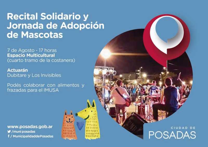La Municipalidad de Posadas organiza un recital para recolectar alimentos y frazadas para las mascotas que se encuentran en el Instituto Municipal de Salud Animal (IMUSA). El mismo se llevará a cabo el domingo 7 de Agosto, desde las 17, en el Espacio Multicultural ubicado en el cuarto tramo de la Costanera.